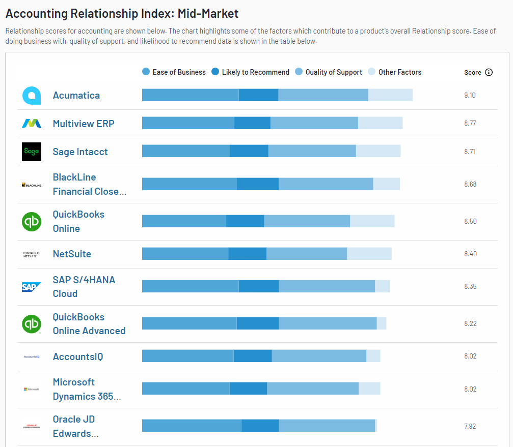 Trong những năm cống hiến các giải pháp quản trị đến các doanh nghiệp, Acumatica đã khẳng định được những thành tựu nhất định trên các bảng xếp hạng phần mềm uy tín trên thế giới
